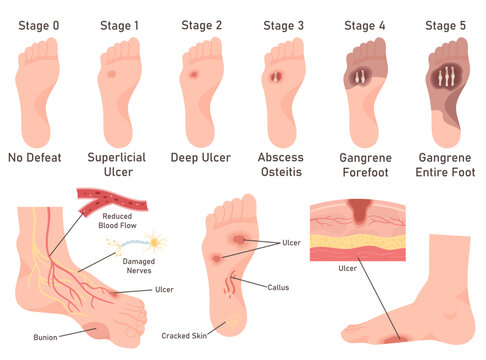 Redness and inflammation are visible on the sole and toes of a person suffering from diabetic foot ulcer, a serious complication of diabetes, isolated on a transparent background