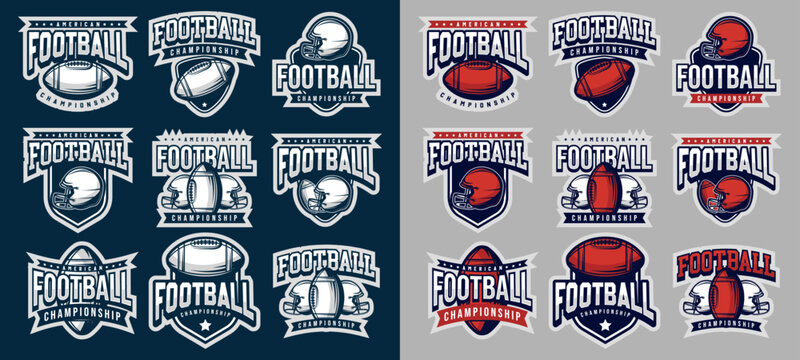 Set of logos, emblems of soccer. Colorful collection of soccer emblems. Football sport tournament logo template, football leagues, championship. Shield, ball, font. Isolated vector illustration