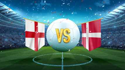 England vs Denmark. Soccer concept. White soccer ball with the flag in the stadium, 2021. 3d render