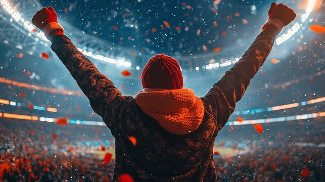 A football fan with raised arms celebrating a victory among a jubilant crowd in a modern stadium, highlighting the exhilaration, camaraderie, and passion of sports spectators.