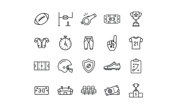 Vector illustration icon set showcasing football elements including a ball, helmet, goalpost, and player in action