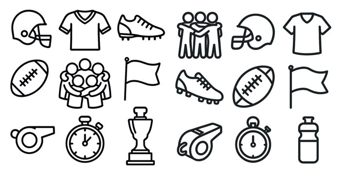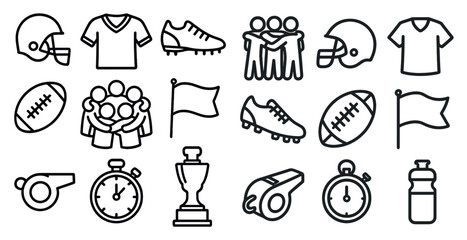 Collection of sports icons and symbols, including a football, a referee, and a trophy. Concept of teamwork and competition
