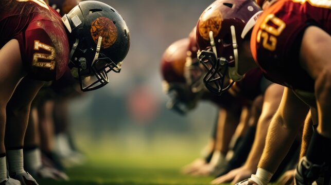 Unity spirit partnership and athletics concept. A team of football players in green uniforms assumes a competitive stance on the field, ready for action during a game.