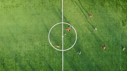 The beginning of a football match and scoring a Goal. Aerial shot of a football match the view from the top
