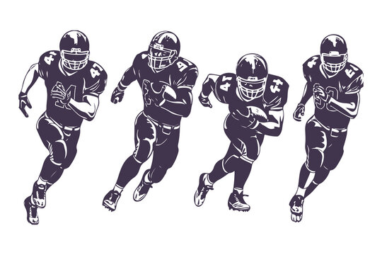 American, football, player, silhouette, action, pose, quarterback, receiver, athlete, sport, run, throw, catch, tackle, dynamic, motion, black, icon, flat, vector illustration