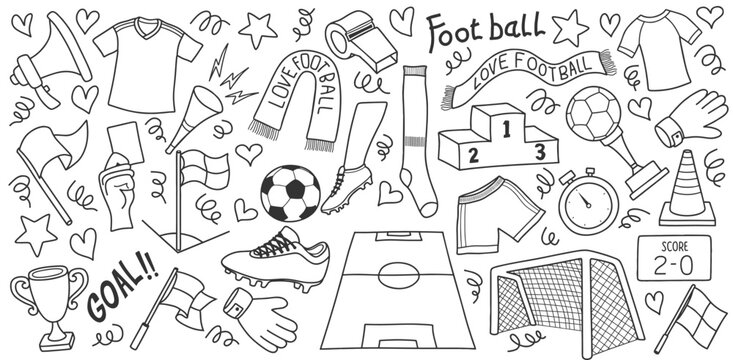 Hand drawn of soccer doodle elements set.