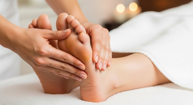 Close-up of a relaxing foot massage session showing therapist hands applying gentle pressure for spa wellness treatment.