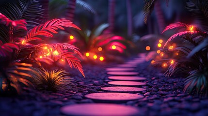 Glowing path with lit foliage amidst plants under a dim sky, leading to mysterious depths