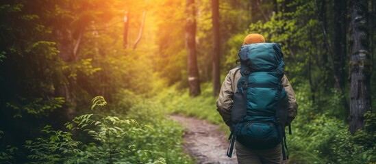 Tranquil scene of a person leisurely walking amidst a lush, green forest at daytime