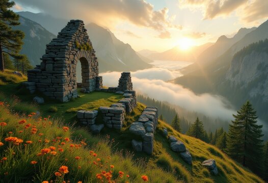Secluded Wooden Cottage Nestled Amidst Lush Tropical Foliage and Serene Waters, Backdropped by Misty Mountains