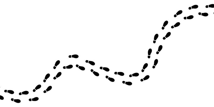 Minimalist trail of human footprints. Silhouettes of bare feet form a winding path of footsteps, symbolizing a walk, a journey, or a path to follow