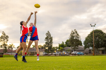 "Australian football" golden 3D text render next to an Australian red football on a green typical oval stadium in the evening under the spotlight