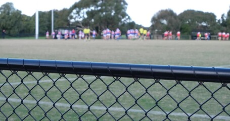 A mesh metal barrier at a sports ground, with a blurry view of two groups of Australian football players finishing games and dispersing. concept of school activity, with high school students competing