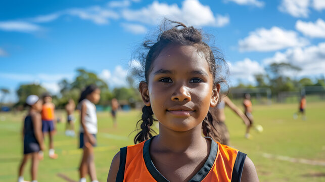 an aboriginal girl wearing athletic wear. she is facing the camera and standing on school ground with her friends playing footy in the background