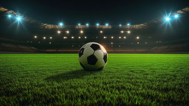 A soccer ball on a synthetic grass-imitating green surface for sports photography with a copy space image.