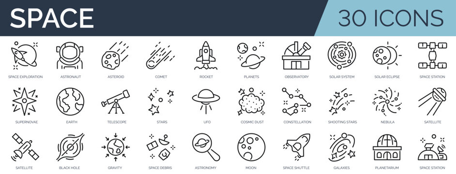 Set of 30 outline icons related to space and astronomy. Linear icon collection. Editable stroke. Vector illustration