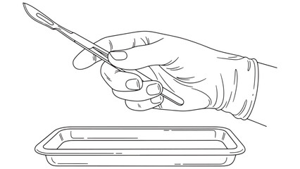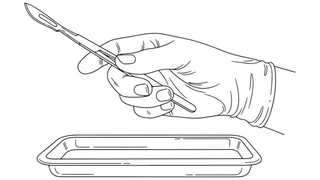 Gloved hand holding scalpel over surgical tray, vector line illustration of aseptic technique, instrument handling and clinical procedure preparation for surgical training materials