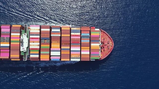Aerial overhead view of a very large container cargo ship crossing the sea