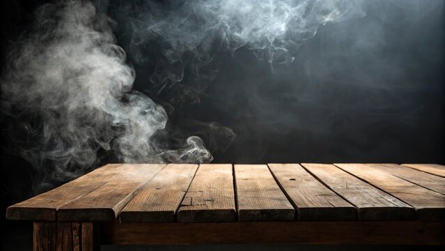 A wooden table sits empty against a dark, foreboding backdrop, with tendrils of smoke curling upwards like serpents, solitude, table