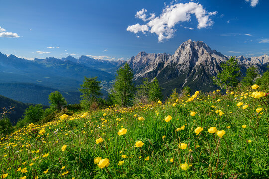 Italy, Veneto, View from Monte Rite to Antelao with meadow in foreground