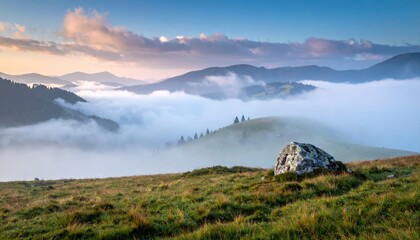 mountain meadow with morning fog bands lone boulder foreground open negative space tranquil scene
