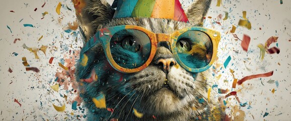 Cat Wearing Colorful Sunglasses and Party Hat with Confetti in Background for Festive and Fun Designs