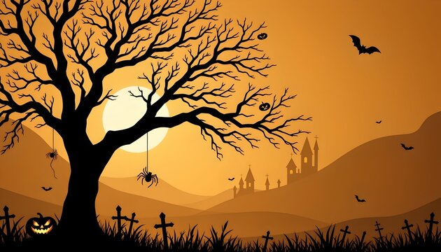 A Halloween themed nightscape with a tree in the foreground and a cemetery backdrop featuring a full moon