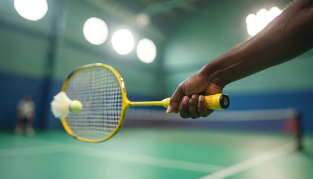 Person plays badminton indoor hitting shuttlecock with racket. Athlete serves during game on court with bright lights. Focus on action shot, sport lifestyle.