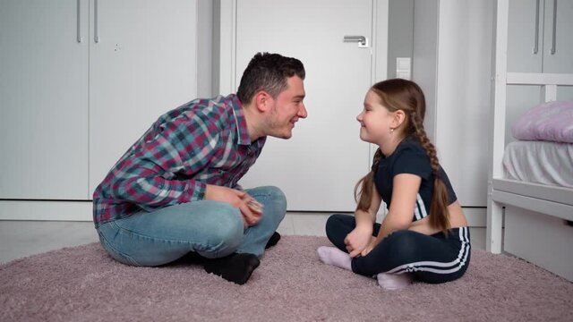 Father and daughter are sitting on the floor in the room. They look at each other. The father takes the child by the cheeks and they touch their foreheads. Positive emotions from father's day