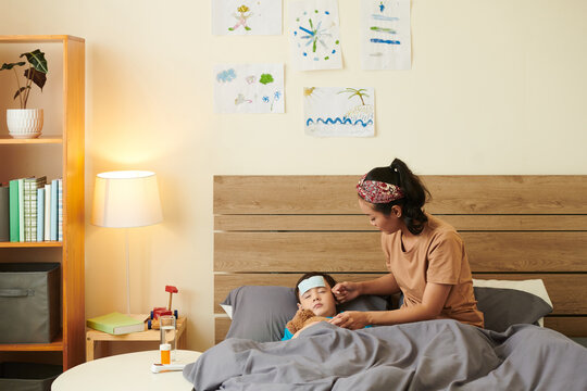 Mother put her hand on the forehead of her daughter who is sick with the flu or another viral disease. Winter seasonal diseases