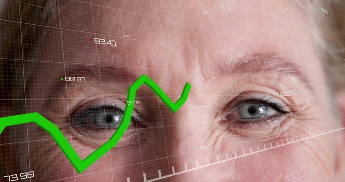 Senior woman holding gaze while green graph entering left and marking forehead health metrics