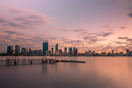 Jetty at South Perth foreshore, Western Australia overlooking city skyline. Water reflections on swan river with cloudy sky, pink, purple, blue hues mirrored on still water, buildings, city, dawn