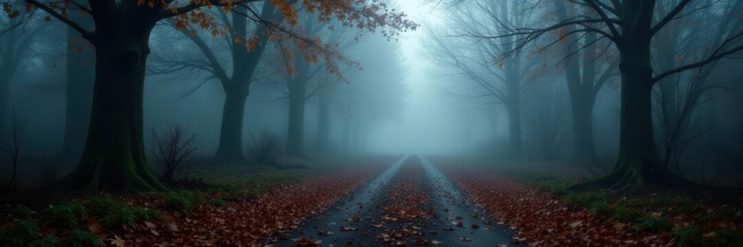 Fog-shrouded trail, decaying leaves, ominous shadows, trees, yellow