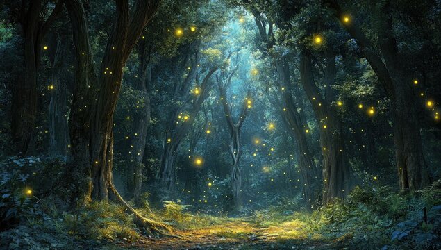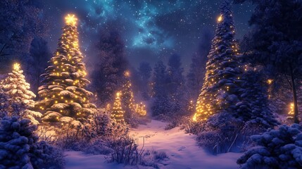 enchanted winter wonderland glowing christmas trees twinkling ornaments starlit night sky soft snowfall magical forest ambiance cozy warmth