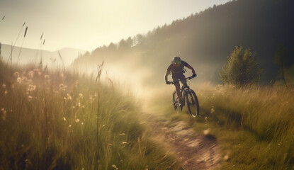 Man in cycling suit riding bicycle near forest illuminated by morning sunlight. Male bicyclist wearing safety helmet while cycling on grassy hill in the morning. Concept of sport and bicycling.