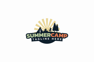 summer camp logo with peoples doing outdoor activities, grilling, playing music.