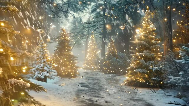 Magical winter wonderland with lit christmas trees in forest path at dusk