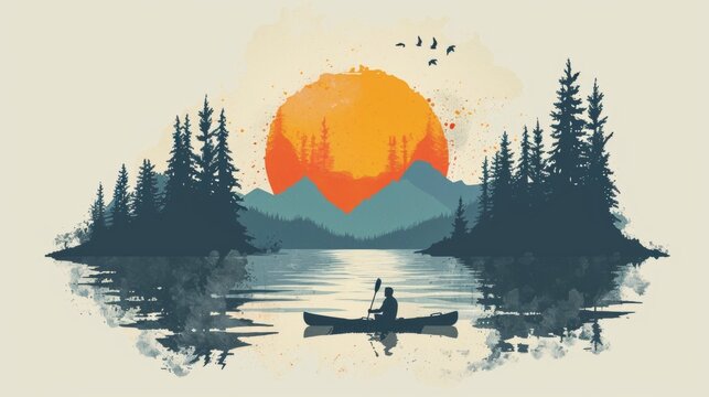 Vintage poster of man kayaking in water with mountain forest and sun.
