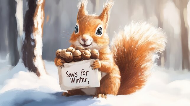 Squirrel collecting acorns for winter forest illustration snowy environment close-up view nature conservation
