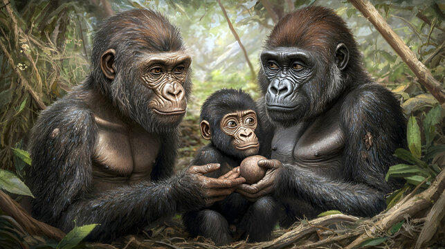 Gorilla family portrait, lush rainforest background, conservation message