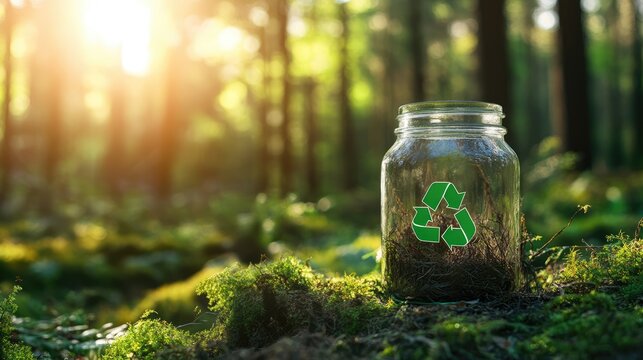 Glass jar with recycling symbol in dense forest, eco-friendly packaging solution for sustainable lifestyle