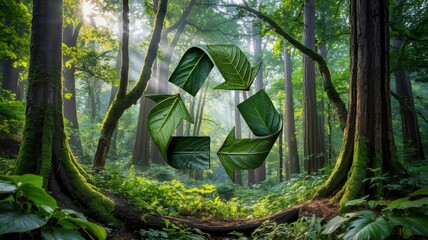 Dense forest with green trees. The forest floor is covered with foliage and small plants. The symbol of waste recycling, consisting of green leaves, is depicted against the background of the forest.