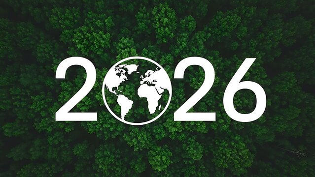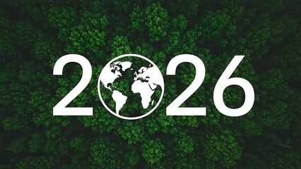 White 2026 text with Earth icon over dense green forest canopy aerial view year future