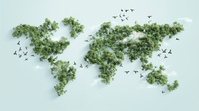 Floating World Map Formed from Dense Green Forest – Eco Concept with Pastel Sky and Copy Space
