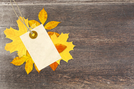 Horizontal background with retro paper label and autumn leaves on old wooden board