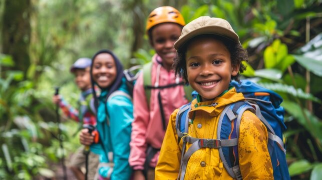 Group of joyful children on an educational adventure hike, exploring and learning in a lush green tropical forest.