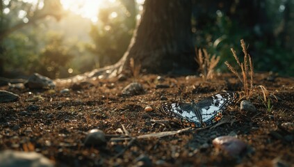 Colorful butterfly resting on leaf litter in woodland, highlighting species diversity, biodiversity awareness