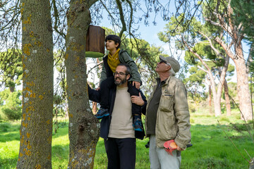 Family inspecting bird nesting boxes in urban forest