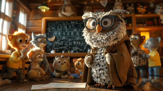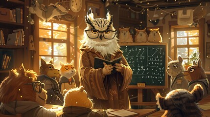 Cute character owl teacher in the classroom