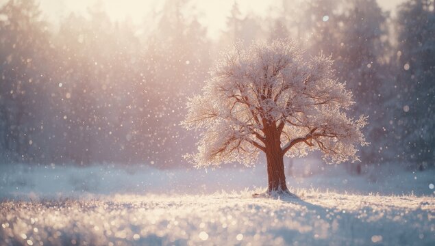 Leafless tree illuminated by sunlight with snow cover, winter preservation focus
